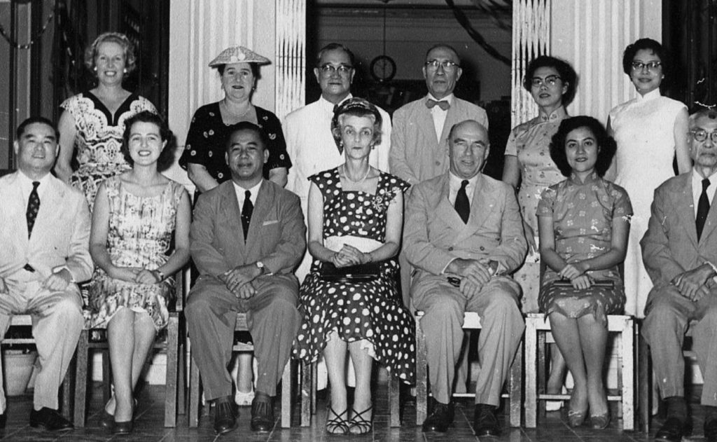Pengetua Cik J. M. Hickes bergambar bersama guru-guru dan staf (1957).